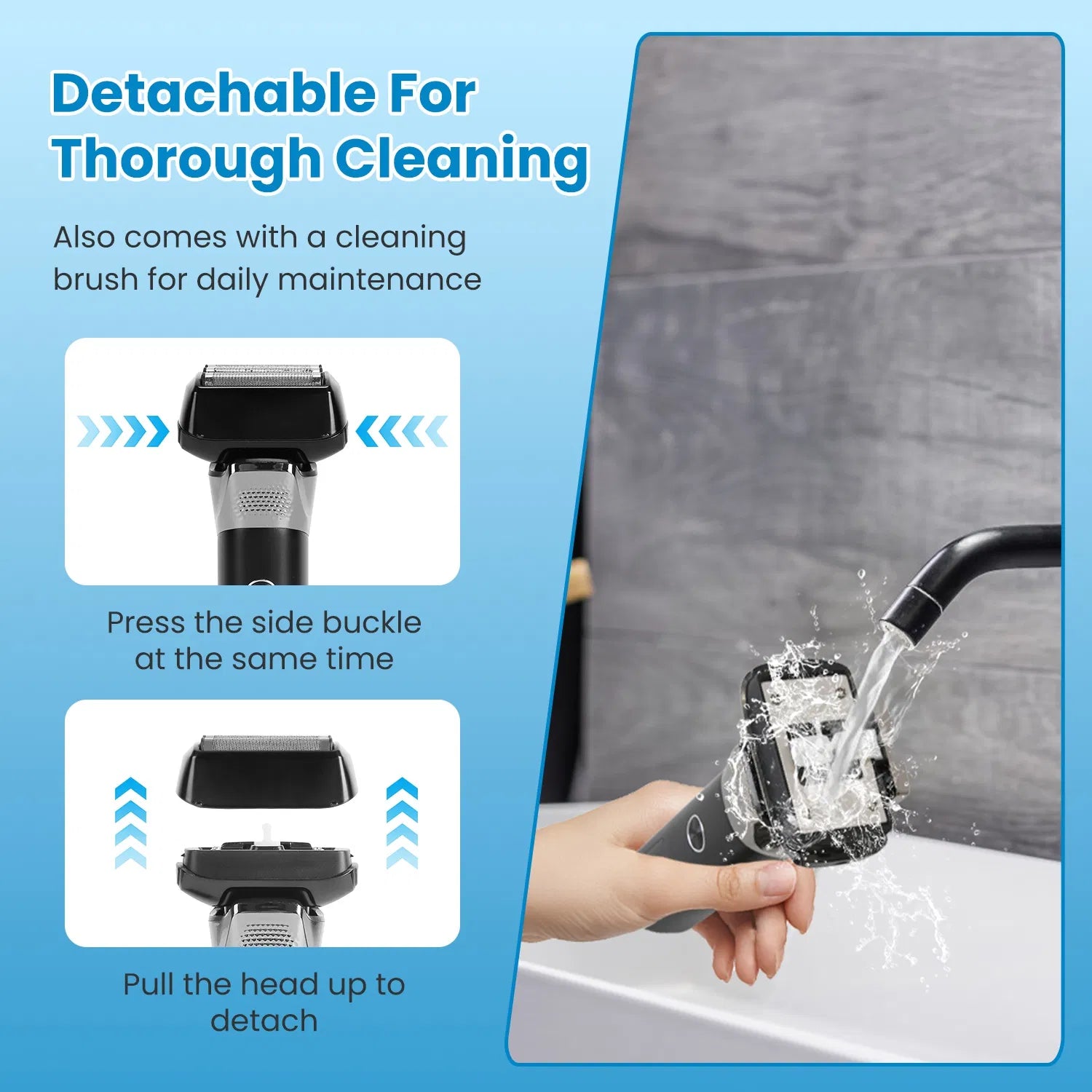 *IPX6 Waterproof & Hassle-Free Cleanup*:Shave wet or dry—this waterproof trimmer works with water,foam,or gel. The detachable magnetic head rinses clean in seconds. We also provide you with a cleaning brush for daily cleaning maintenance. Note:Do not submerge the device in water.
